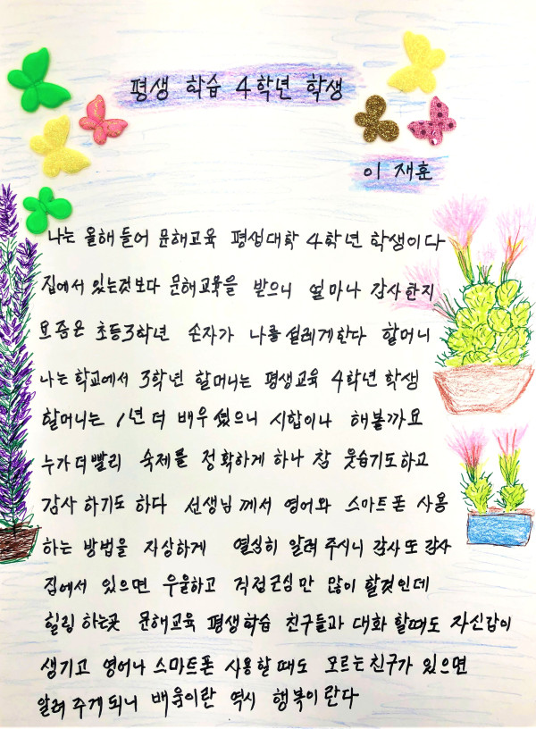 평생대학 4학년 학생이 되며 3학년이 된 손자와 자신을 견주어 보며 학습에 대한 성취감을 고취시킴