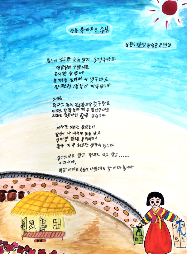 남편이 돌아가시고 글자를 모르니 불편한 점이 한 두 가지가 아니어서 글자를 배우려고 마음을 먹고, 글자를 배울 수 있는 곳을 팔방으로 수소문하여 평생학습관을 찾았다. 길을 가다가도 모르는 글자가 나오면 젊은이들에게 묻기를 서슴지 않았고, 밤낮으로 노력한 결과 겨우 글을 터득하게 되었다. 아직 갈 길은 멀지만 글을 읽을 수 있음에 감사하고, 앞으로도 더 열심히 하여 마음속의 글들을 마구마구 쏟아내고 싶은 희망이 생겨난 것도 크게 감사할 일이다.