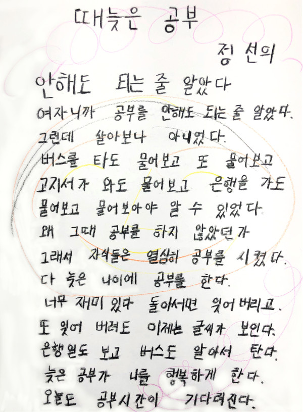공부를 하기 전에는 서울의 자식들 집에 가려면 묻고 또 물어 차를 타고 다녔다. 지금은 차표도 내가 사고, 차도 내가 알아서 타고, 자리도 내가 찾아서 앉는다. 오빠들만 공부를 해야하는 줄 알고 공부를 하지 않았는데, 살다보니 너무 후회가 되었다. 다 늦어서 하는 공부가 재미있다.