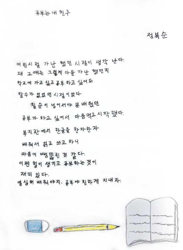 정복순 어르신은 공부에 대한 열정이 남다르신 분입니다. 작품 내용은 어린 시절 가난 때문에 공부할 때를 놓치고 칠십 넘어서 시작한 공부로 배움의 한을 풀고, 삶의 재리를 느끼고 있다는 내용입니다.