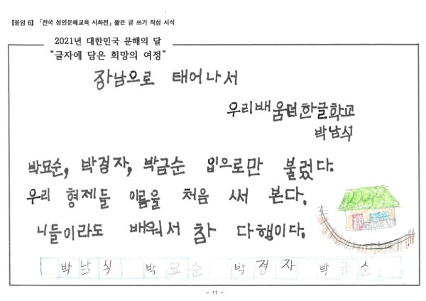 가난한 집 장남으로 태어나 어린 나이부터 온갖 험한 일을 하며 가족을 돌봐야 했다. 지금 잘 사는 동생들을 보면 그때 힘들어도 가르치기 잘했다는 생각이 든다. 수없이 부르기만 했지 한 번도 써 보지 못한 동생들의 이름을 글을 배우고 처음으로 써 본다.
