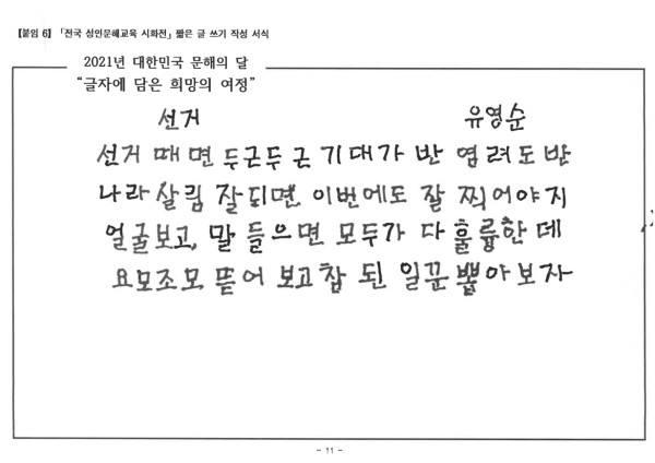 6·25전쟁으로 피난 다니느라 학교 근처에도 못가봐서 공부에 대한 의지가 있었음 집 가까이 노인복지관에서 한글공부를 하는지도 몰랐는데 친구의 권유로 성인문해 한글교실에 다니기 시작함 집 앞에 나가서 간판 읽는 재미도 있고 집에서도 복습을 하게 됨 치매가 조심스러워서 건강이 되는 한 한글교실에 계속 다니고 싶음 우리나라 걱정에 대한 마음을 선거라는 제목으로 시에 녹여 표현함