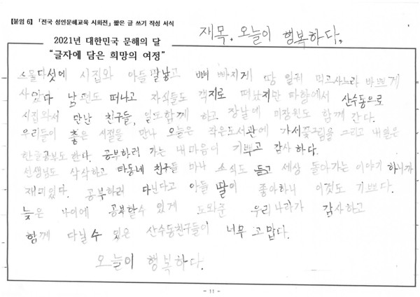 작은도서관에서 한글공부를 시켜준다고 해서 산수동 친구들과 등록을 하고 셋이서 쌍둥이들처럼 일주일에 3번을 다닌다. 머리에는 잘 들어오지않고 잘 잊어버리기 일쑤지만 그래도 공부하러 오가는 길이, 공부시간이 기쁘고 행복하다.