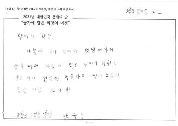 오랜 당뇨로 눈 건강이 안 좋으시지만 꾸준하게 문해교실에서 공부를 하신다. 한글을 맞춤법도 안 틀리게 잘 배워서 큰 사위에게 멋진 시로 고마움을 전하고 싶다고 하신다. 부끄러움이 많으시지만, 봉사정신이 투철해서 경로당의 청소와 정리정돈을 도맡아 하신 덕분에 경로당이 항상 깨끗하다. * 어린 시절에 초등교육 3학년과정을 마침