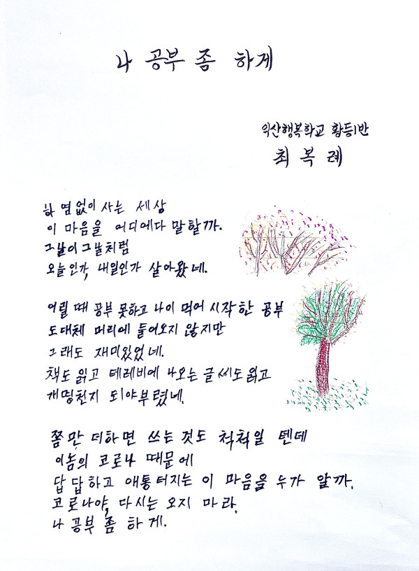 코로나로 인해 대면 수업을 할 수 없어 답답했던 심정과 공부에 대한 절박한 마음을 평소 화자의 언어로 실감나게 표현한 작품입니다.