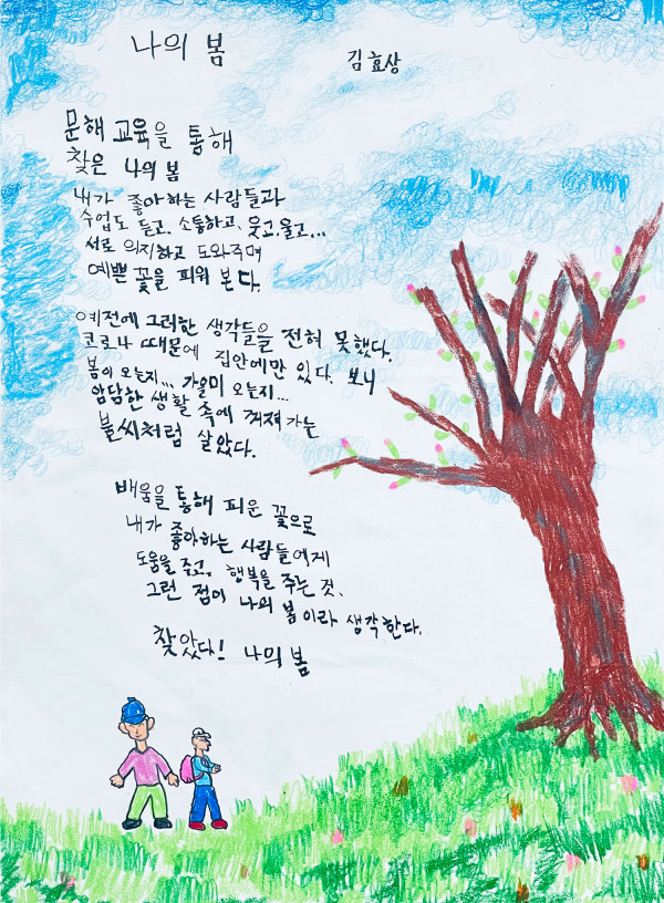 코로나로 인해 집에서만 있어 무의미하고 무기력한 삶을 보내고 있었는데 복지관에서의 성인문해교육을 통해 배움의 기쁨과 즐거움을 알아가는 중이랍니다.