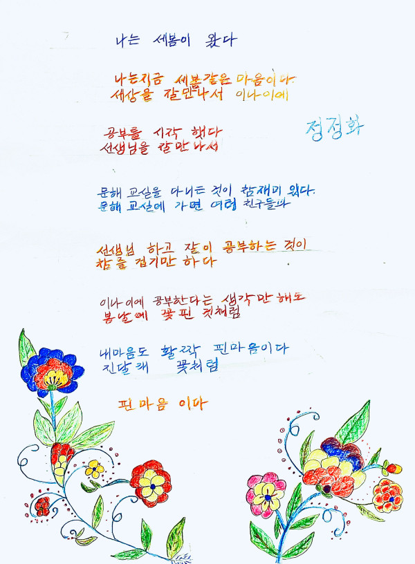 6.25전쟁으로 생활이 너무 어려워 못 배운게 한이 되어 독학으로 한글공부를 시작했습니다. 받침을 잘 쓸 줄 모르지만 80세에 공부를 할 수 있어 너무 기쁩니다. 생전 처음 잡아본 색연필로 그림도 그리고 숙제도 2배이상하면서 그림일기도 매일 씁니다. 한글을 열심히 배워 손주들에게 손 편지를 보내고 싶습니다.