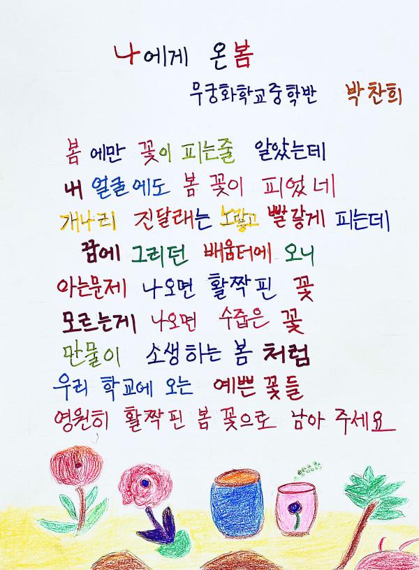 배움에 대한 열망을 가슴에 품고 살다가 학교에 다니게 되어 기쁘고 즐거운 지금의 자신을 활짝 핀 봄꽃에 비유하여 늦깎이 학생으로서의 배움의 즐거움과 행복함을 표현한 작품입니다.