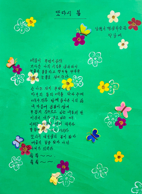 황혼의 문턱에서 내 인생의 봄이 왔다. 또다시 봄이 왔다. 배움의 꽃을 찾아 나선 나비가 되어 자유롭게 훨훨 날아가고 싶다.