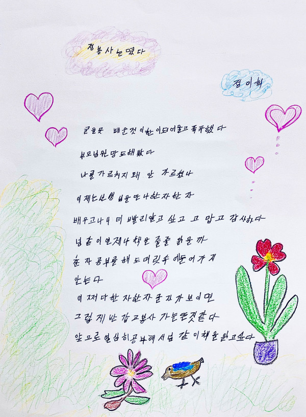 경로당에서 친구들이 책을 읽는 모습을 보고 나도 공부하고 싶다고 생각했지만, 어렸을 적 배우지 못했다는 창피한 마음에 공부하러 가지 않았습니다. 그러다 어느 날 공부를 해야겠다고 다짐하여 작년부터 한글 공부를 하게 되었습니다. 남들보다 늦게 시작한 공부인 만큼 누구보다 열정적으로 공부하고 있습니다.