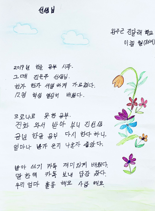 80세가 넘어서 진달래학교를 입학하여 선생님과 마을 친구들과 한글 공부를 하게 되어, 공부의 재밌음을 느끼고, 딸과 한글로 카톡을 주고 받음에 행복함을 느끼게 되었습니다.