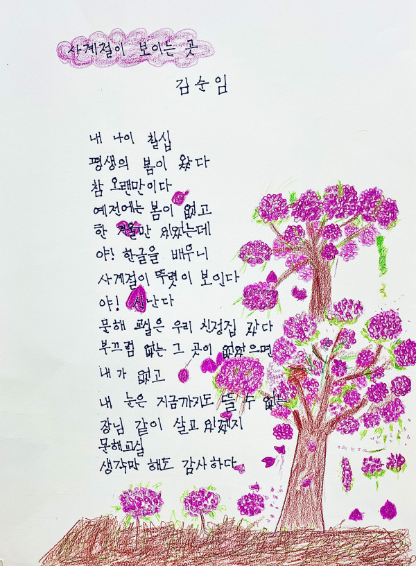 예전에는 봄이 없고, 한 겨울만 있었는데, 한글을 배우니 사계절이 뚜렷이 보인다는 표현에서 화자의 애절함을 느낄 수 있는 작품입니다.