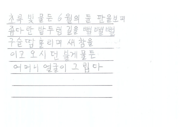 초록빛으로 물든 6월의 들판을 보면서 옛 생각을 해보게 되고 그 옛날 구슬땀 흘리시던 어머님을 상상하면서 작성하신 내용으로 아름다운 회상의 선율을 느낄 수 있는 작품입니다.