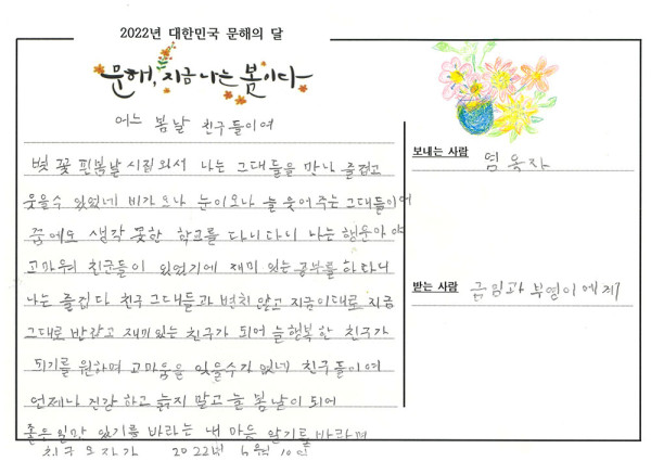 농촌에서 살게 되었는데, 한동네에 사는 동갑내기 친구 둘이 늘 곁에서 모내기할 때 도와주고, 심을 때를 일러 주고 자주 만나서 늘 웃고 어울리던 그 친구들에게 위안을 얻으며 살아왔다. 어릴 때 못 배운 공부를 하고 싶어 친구들 따라 학교에 왔다. 글씨도 쓰고 선생님 사랑도 받고 꽃도 그려보면서 꽃이 이쁜 걸 알았다. 배움의 기쁨을 느끼면서 친구들에게 고마움을 글로 전해본다.