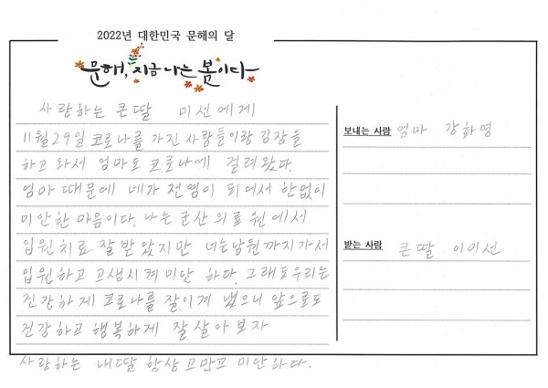 코로나가 한참일때 동네 지인이 김장하면서 양념간을 봐 달라 하셔서 친구집에 갔다가 코로나에 감염이 됐습니다. 의도치않게 한 집에 살고 있는 큰딸이 코로나에 전염이 됐고, 병실이 없어서 가족들과 떨어진 남원까지 가서 치료를 받게 되었습니다. 너무 미안한 마음을 엽서에 담아 표현 하였습니다.