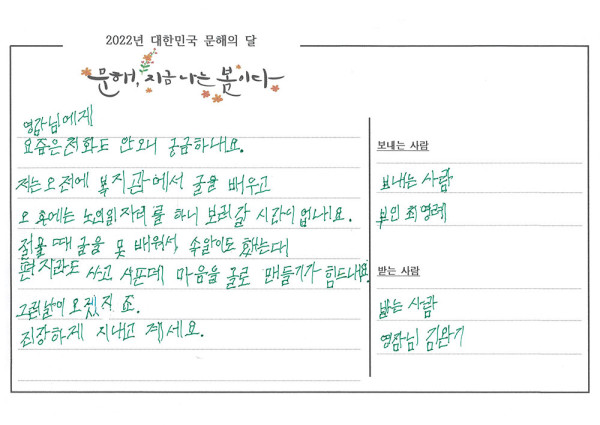 건강사정으로 배우자와 따로 지내고 있습니다. 가끔 만나러 갔었는데 요즘 한글공부도 하고 노인일자리도 하느라 바빠서 남편을 보러 가지 못했습니다. 남편에 대한 그리움을 담아 편지를 써 보았습니다.