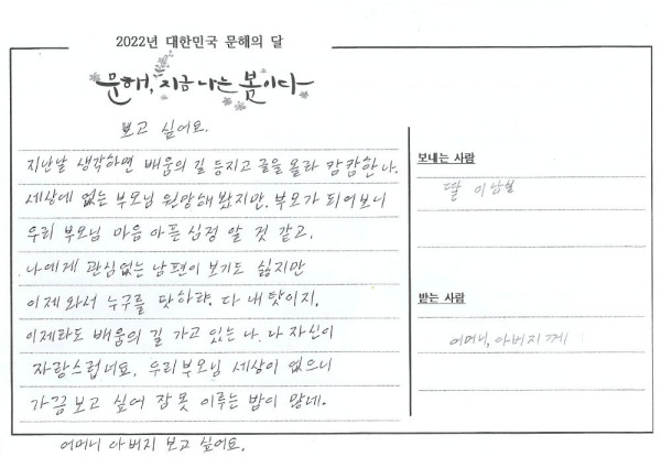 학교를 보내주지 않은 돌아가신 부모님을 원망하기도 했지만 자식을 낳아 키워보니 부모님 마음이 많이 아팠을 것을 알게 된 화자는 이제라도 한글학교를 다니며 배움의 길을 가는 것이 자랑스럽다는 마음을 담은 작품입니다.