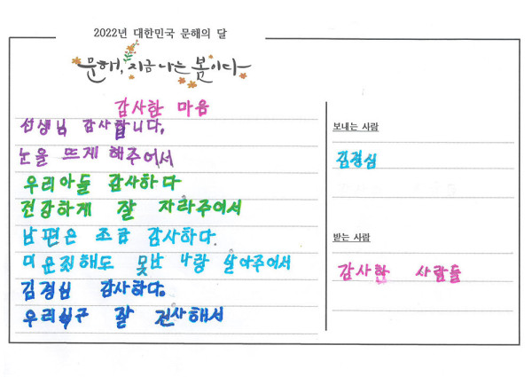 ‘글을 가르쳐주는 선생님께, 잘 자라준 아들에게, 밉지만 못난 나와 살아준 남편에게, 그리고 이 가정을 잘 건사한 나에게’라며 글을 배우면 감사한 마음부터 전하고 싶었다는 화자의 따뜻한 마음이 돋보이는 작품입니다.