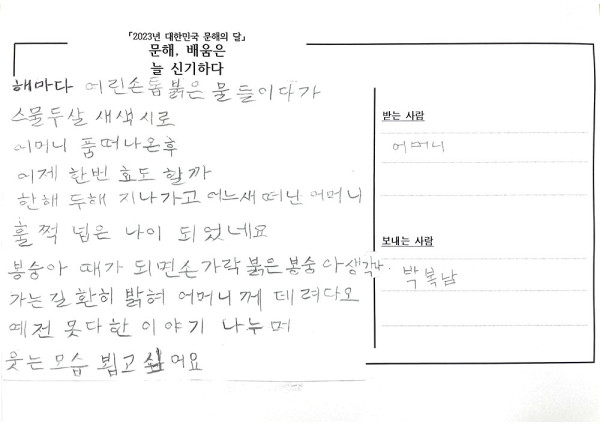 봉숭아 > 2023성인문해교육 엽서쓰기