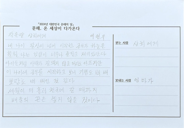 작은 딸 상희에게 > 2024성인문해교육 엽서쓰기