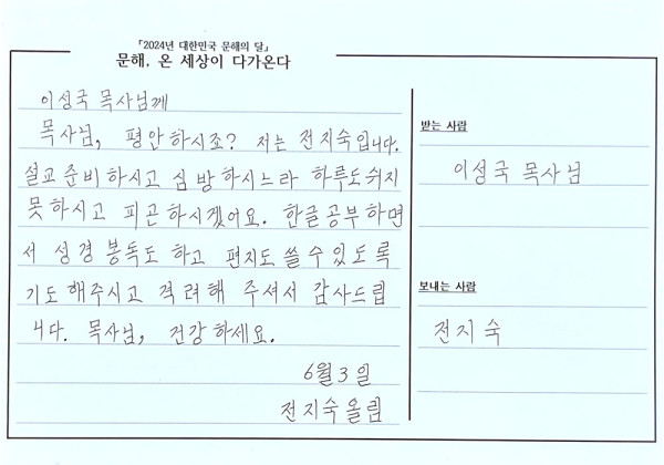 목사님께 드리는 편지 > 2024성인문해교육 엽서쓰기