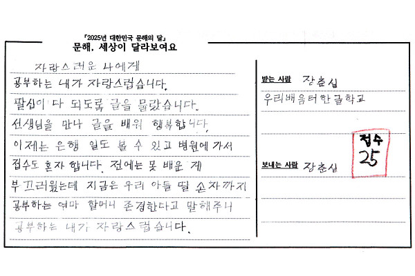 자랑스러운 나에게 > 2025성인문해교육 엽서쓰기