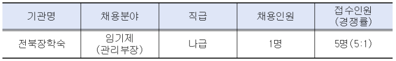 임기제 나급(관리부장) 채용 접수현황 공개 페이지 정보 작성자 인재평생교육진흥원 댓글 0건 조회 10,878회 작성일 22-06-08 09:24 본문 목록 이전글 2022년 임기제 나급(관리부장) 채용 서류전형 합격자 및 면접시험 일정 안내 다음글 JB 선도산업 육성방안 탐구 지원사업 참가팀 모집공고 댓글목록 댓글목록 등록된 댓글이 없습니다.