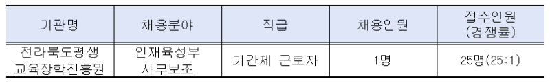 기간제근로자 채용 원서접수 결과 페이지 정보 작성자 인재평생교육진흥원 댓글 0건 조회 7,877회 작성일 22-09-02 18:09 본문 기간제근로자 채용 원서접수 결과 목록 이전글 기간제근로자 채용 서류전형 합격자 및 면접시험 공고 다음글 2022년도 전라북도서울장학숙 청운관 입사생 추가모집 선발 요강 댓글목록 댓글목록 등록된 댓글이 없습니다.