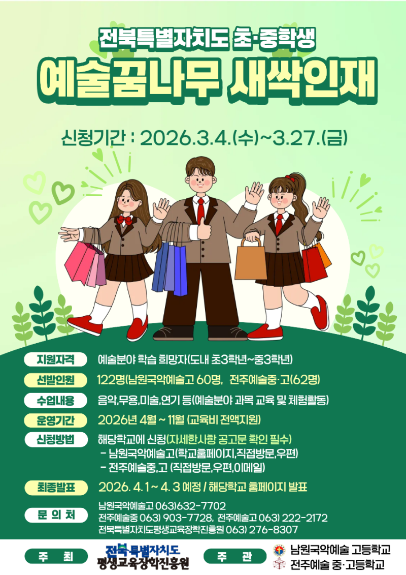2026년도 「예술꿈나무 새싹인재 육성사업」이 아래와 같이 진행됩니다.