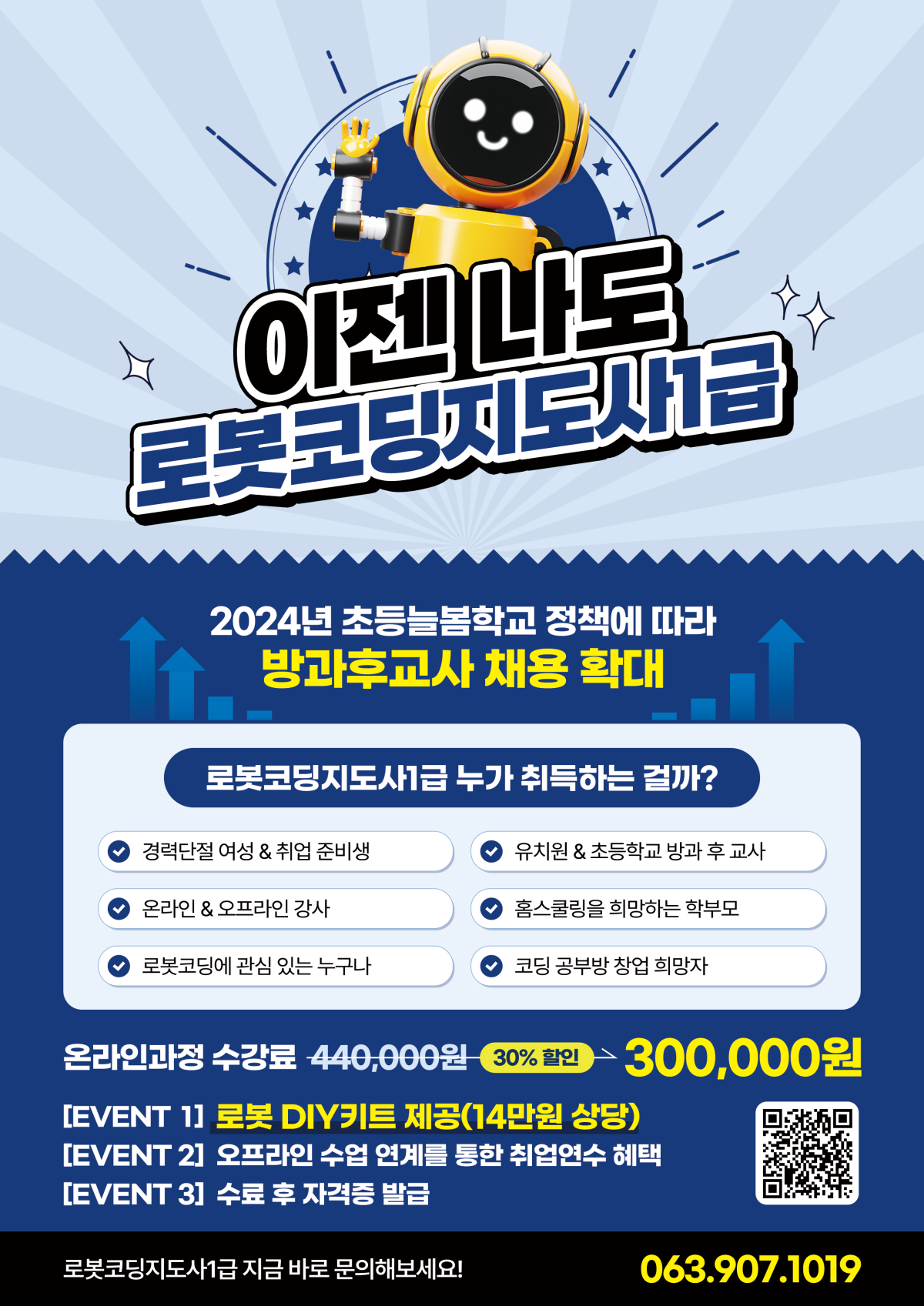 [비전원격평생교육원] 로봇코딩지도사1급(온라인 과정) 수강생 모집 안내 페이지 정보 작성자 전북평생교육장학진흥원 댓글 0건 조회 1,822회 작성일 23-10-24 13:20 본문 [비전원격평생교육원] 로봇코딩지도사1급(온라인 과정) 수강생 모집 안내 목록 이전글 [안내] d·camp와 함께 하는 광주 워크넥트 참가자 모집 다음글 익산형 MVP 지원사업 추가 모집 공고 댓글목록 댓글목록 등록된 댓글이 없습니다.