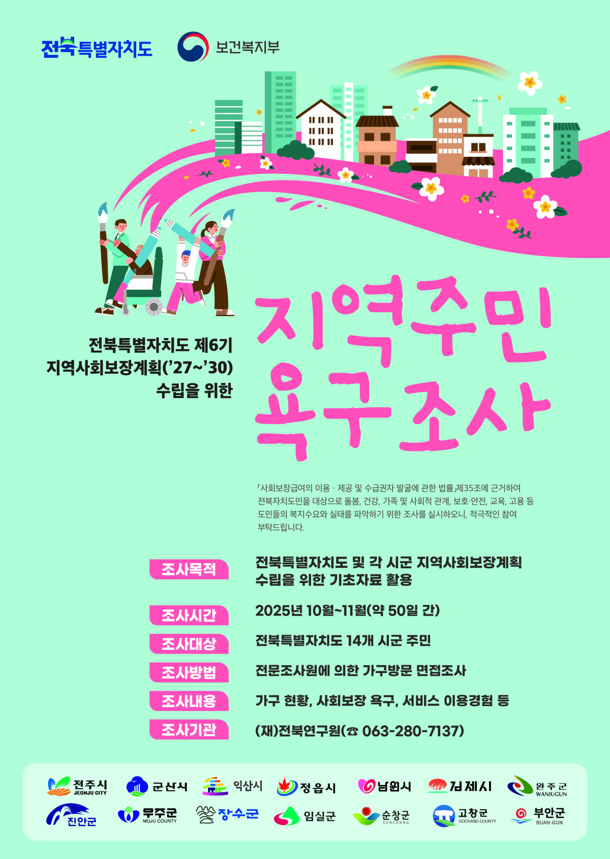 [전북특별자치도 안내] 제6기 지역주민 욕구조사 실시 안내 페이지 정보 작성자 전북특별자치도평생교육장학진흥… 댓글 0건 조회 45회 작성일 25-11-28 17:56 본문 [전북특별자치도 안내] 제6기 지역주민 욕구조사 실시 안내연결주소 : https://www.jeonbuk.go.kr/board/view.jeonbuk?boardId=BBS_0000005&menuCd=DOM_000000102001001000&orderBy=REGISTER_DATE:DESC&paging=ok&startPage=1&dataSid=634039 목록 이전글 [전북특별자치도 안내] 특별지방자치단체 활성화 방안 토론회 개최 다음글 [전북특별자치도] 2026 전북특별자치도 블로그 기자단 모집 안내 댓글목록 댓글목록 등록된 댓글이 없습니다.