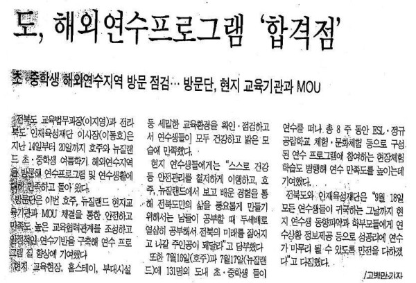 호주,뉴질랜드 연수학교 MOU체결 페이지 정보 작성자 관리자 댓글 0건 조회 5,414회 작성일 11-08-22 09:00 본문 해외연수 여름학기 호주,뉴질랜드 현지교육기관 MOU체결 목록 이전글 출연기관 기관장 정년제한 다음글 서울장학숙 농촌봉사활동 댓글목록 댓글목록 등록된 댓글이 없습니다.