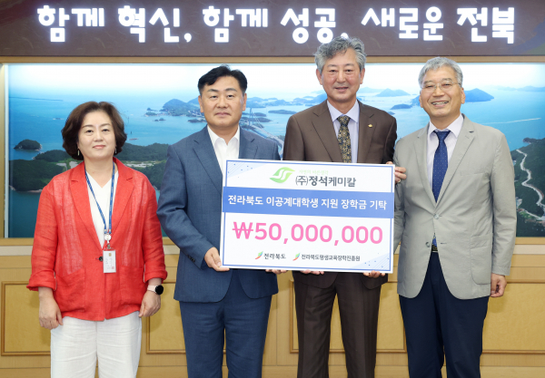 23일 전북도 등에 따르면 이날 정석케미칼은 ‘전북지역 이공계 대학 인재 양성을 위해 써달라’며 장학금 5000만원을 전라북도평생교육장학진흥원에 기탁했다.