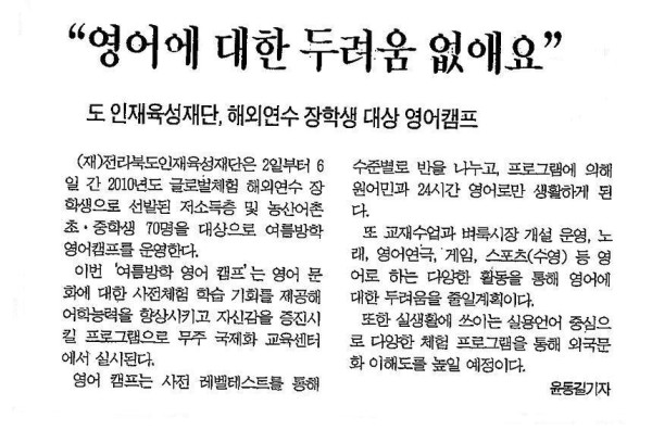 해외연수생 여름방학 영어캠프 운영 페이지 정보 작성자 관리자 댓글 0건 조회 5,572회 작성일 10-08-03 17:58 본문 글로벌체험 해외연수 연수생 하계영어캠프 운영 관련기사 목록 이전글 도내 공기업,출연기관 경영평가 다음글 전라북도장학숙(서울,전주)2학기 입사생 모집 댓글목록 댓글목록 등록된 댓글이 없습니다.