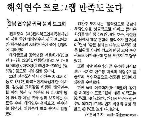 2010 글로벌해외연수 귀국성과보고회 및 만족도 페이지 정보 작성자 관리자 댓글 0건 조회 5,279회 작성일 10-10-25 17:35 본문 성과보고회 및 만족도 기사 목록 이전글 서울장학숙(청운관) 고시합격자 배출 다음글 2010 글로벌체험 해외연수(여름학기) 귀국 댓글목록 댓글목록 등록된 댓글이 없습니다.