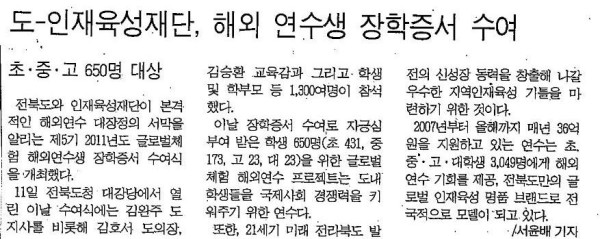 2011해외연수 장학증서 수여식 페이지 정보 작성자 관리자 댓글 0건 조회 5,177회 작성일 11-06-13 19:25 본문 글로벌 해외연수 장학증서 수여식 목록 이전글 서울장학숙 고시원(청운관) 입사생 선발 다음글 대학 입학사정관 박람회 개최 댓글목록 댓글목록 등록된 댓글이 없습니다.