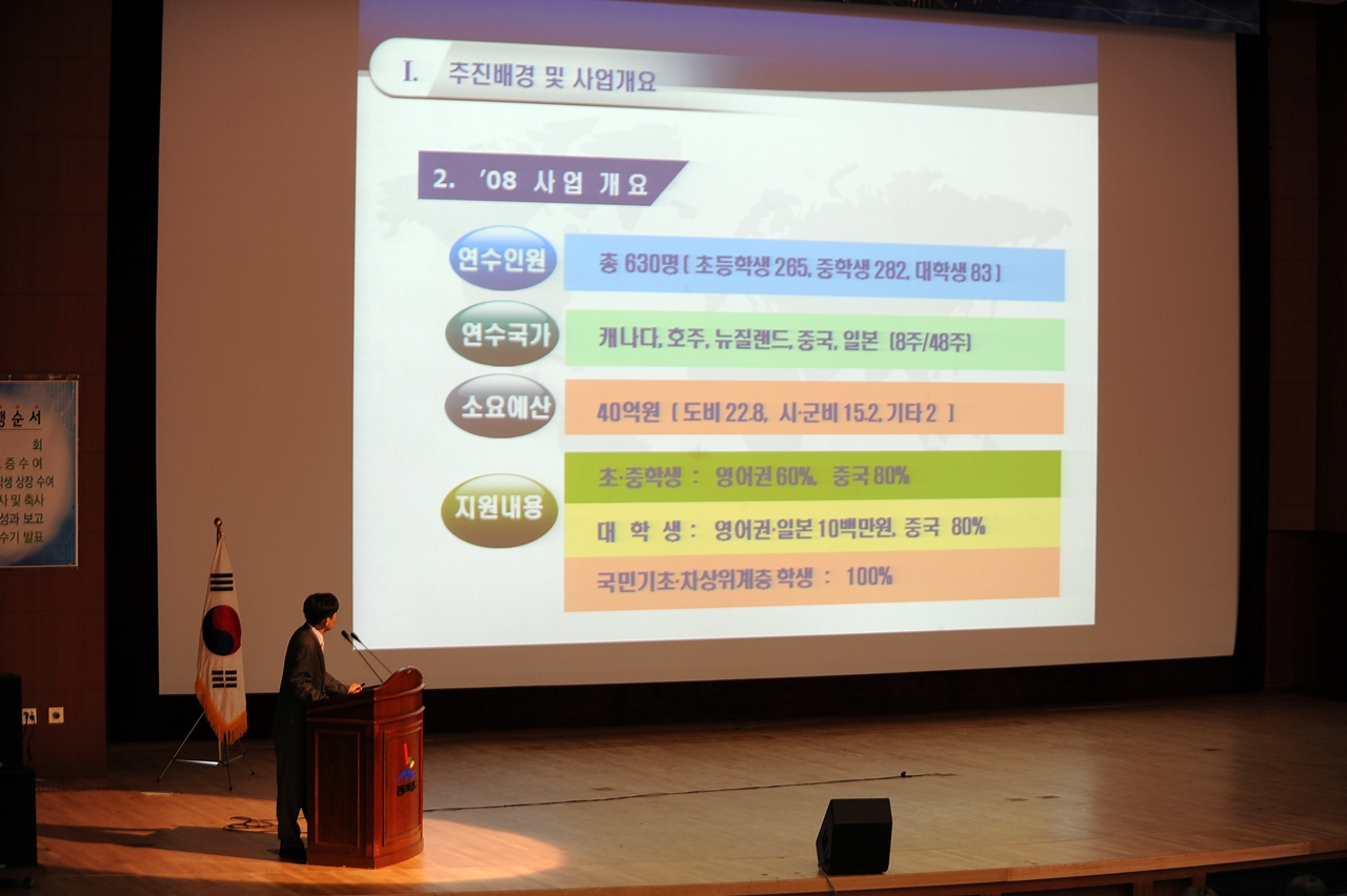 2008 해외연수 여름학기 성과보고 페이지 정보 작성자 관리자 댓글 0건 조회 3,234회 작성일 09-06-03 18:58 본문 2008 여름학기 연수생 성과보고 개최(08.10.11) 목록 이전글 2009글로벌체험 해외연수 장학증서 수여식 다음글 2008 해외연수 여름학기 성과보고 댓글목록 댓글목록 등록된 댓글이 없습니다.